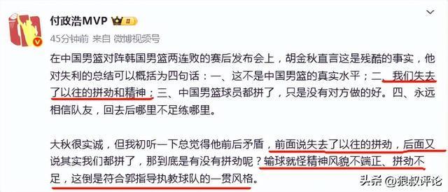 媒體人付政浩點(diǎn)評(píng)說(shuō)道:“大秋很實(shí)誠(chéng),但我初聽(tīng)一下總覺(jué)得他前后矛盾,前面說(shuō)失去了以往的拼勁,后面又說(shuō)其實(shí)我們都拼了,那到底是有沒(méi)有拼勁呢?輸球就怪精神風(fēng)貌不端正、拼勁不足,這倒是符合郭指導(dǎo)執(zhí)教球隊(duì)的一貫風(fēng)格。”